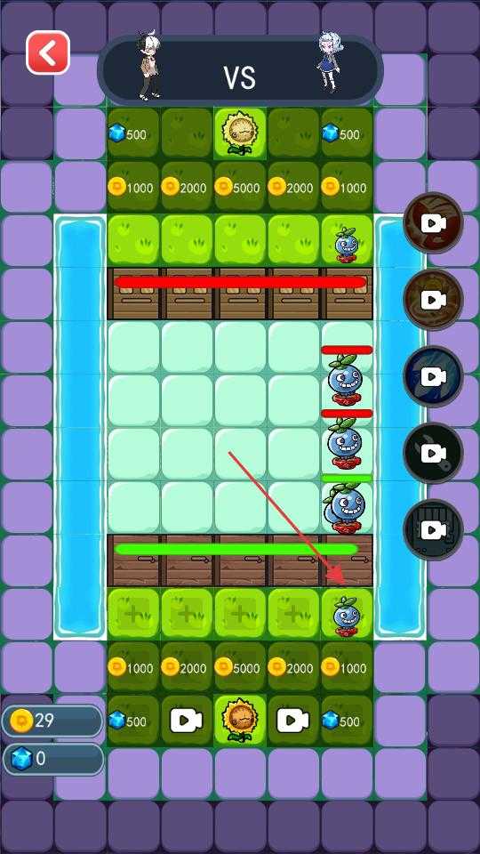 3、进入对战关卡后在绿色的格子区域布置植物,利用场景中的金币资源,选择合适的植物放置在格子上,构建防御或攻击阵容,同时留意对手的植物布置情况。