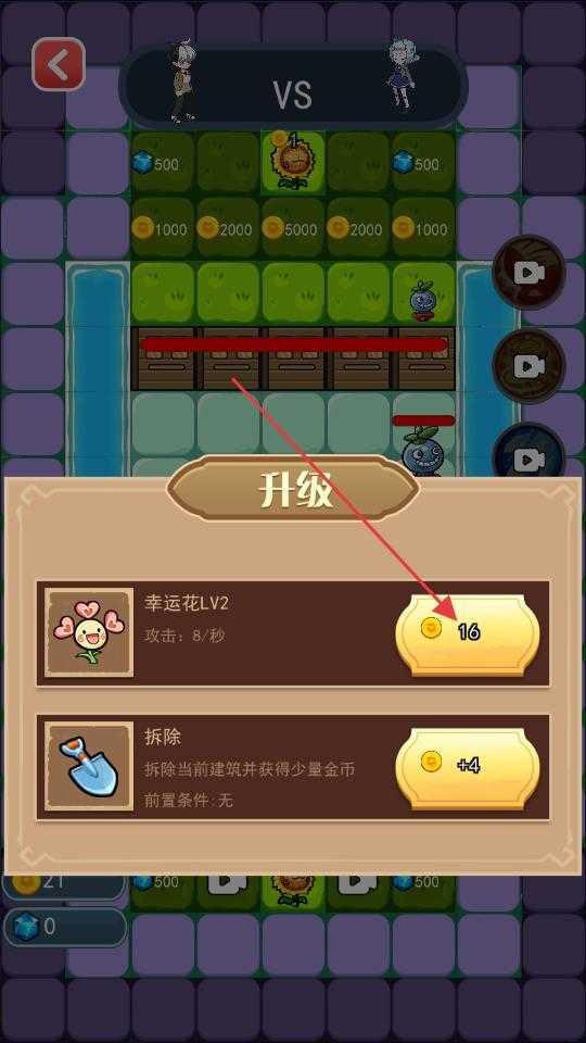 4、当植物布置到一定阶段界面会弹出升级选项窗口,选择消耗金币将植物升级,提升植物的攻击等属性,借助升级后的植物增强对战能力,推进游戏的进程。