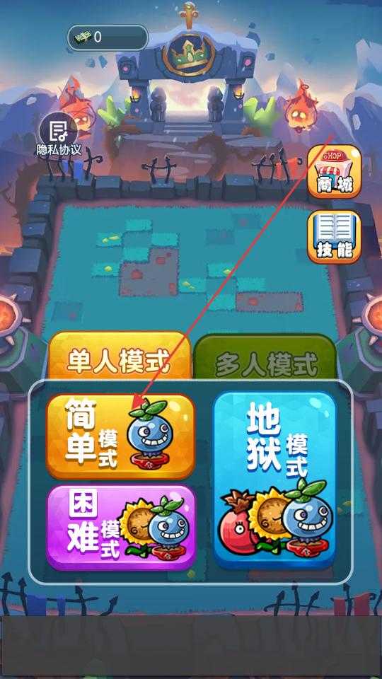 2、在模式选择场景中点击单人模式下的简单模式选项,进入对应的对战关卡,此时留意界面右侧的商城、技能等功能按钮,以及关卡内的植物和金币分布。