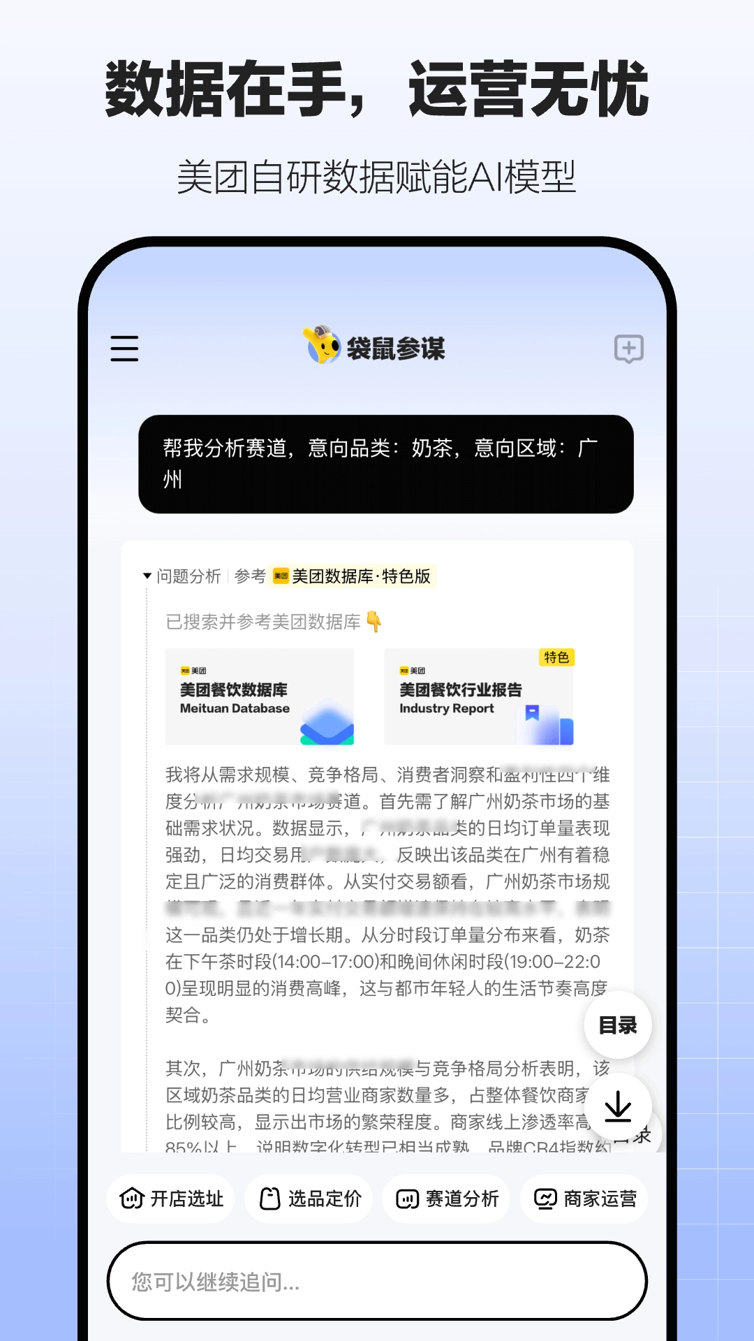 袋鼠参谋,是由北京三快科技有限公司打造的一款借助AI与大语言模型助力商家运营的APP。借助袋鼠参谋,用户能够结合本地数据,为商家提供一系列实用功能,比如选址建议、运营数据分析以及运营改善建议等。商家只需在对话框输入问题,袋鼠参谋就能给出答案。其AI内核是美团自主研发的大模型“Longcat龙猫”,这确保了强劲的性能以及隐私得到有效保护。美团的入驻商家可以下载袋鼠参谋,获取给力的运营建议。